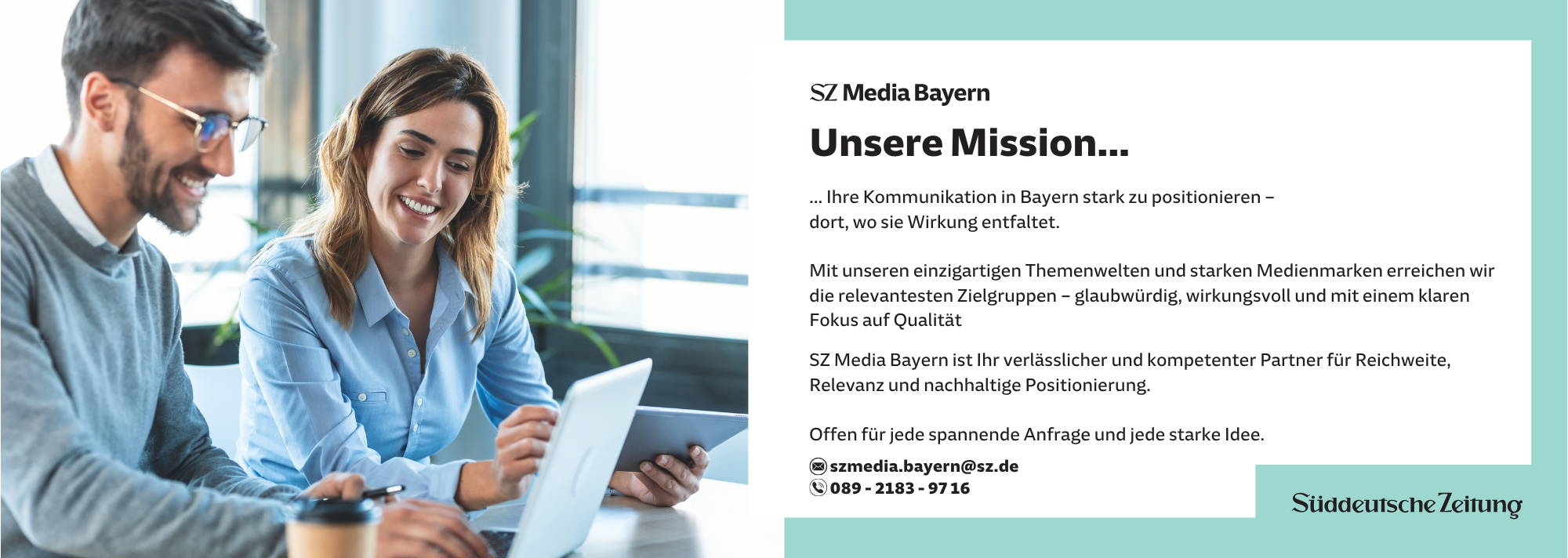 Bei uns, der Süddeutschen Zeitung und sz.de, profitieren Sie von einem vertrauenswürdigen Qualitätsumfeld, in dem Ihre Markenbotschaften besonders hohe Glaubwürdigkeit genießen.